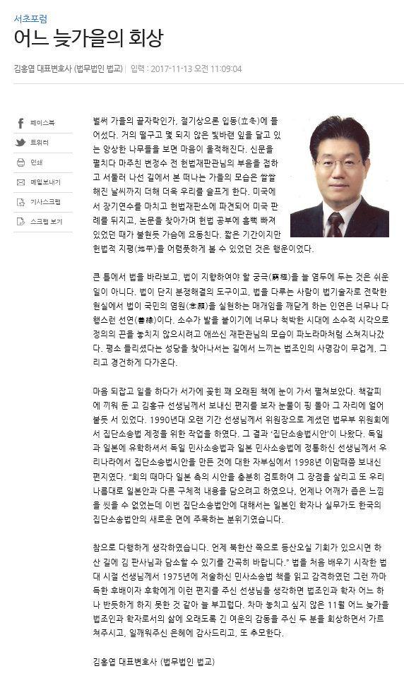 어느 늦가을의 회상 (2017. 11. 13.자 법률신문 서초포럼)